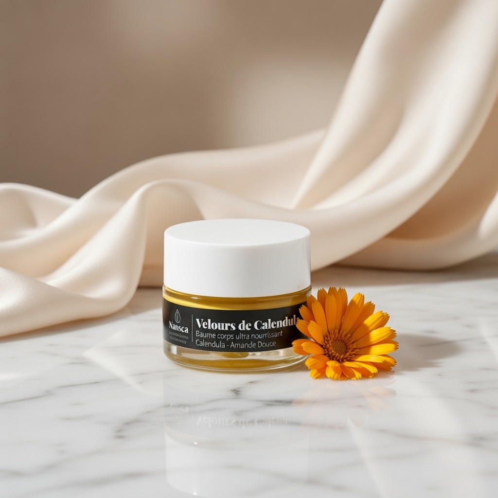 Le Baume Corps au Calendula & Amande Douce de Nansca est un soin corporel apaisant et réparateur d'exception, formulé artisanalement avec les deux actifs naturels les plus doux et les plus reconnus de la phytothérapie et de la cosmétique verte pour soulager, nourrir et régénérer les peaux les plus fragilisées, irritées et sensibles. Le calendula (Calendula officinalis), connu depuis l'Antiquité sous le nom de souci des jardins, est l'actif apaisant végétal de référence. Ses fleurs sont naturellement concentrées en flavonoïdes (narcissine, isoquercitroside), en triterpènes (oleanolic acid, ursolic acid), en polysaccharides et en caroténoïdes aux propriétés anti-inflammatoires, cicatrisantes, antibactériennes et antifongiques puissantes et bien documentées cliniquement. Ces actifs réduisent les médiateurs inflammatoires (prostaglandines, cytokines pro-inflammatoires), accélèrent la réépithélialisation des peaux abîmées, soulagent les rougeurs, brûlures légères, piqûres d'insectes et eczéma, et favorisent la régénération des peaux fragilisées par les traitements médicaux ou les agressions environnementales. L'huile d'amande douce biologique complète cette formule apaisante de ses propriétés émollientes, nourrissantes et adoucissantes. Sa richesse en acides gras essentiels (oméga 6 et 9) et en vitamines A et E nourrit les peaux sèches et sensibles, restaure la barrière cutanée et prévient la perte en eau. La texture riche et onctueuse du baume fond au contact de la chaleur de la peau pour une pénétration et un confort optimaux. Un véritable soin ultra-nourrissant, protecteur et réparateur pour peaux fragilisées.